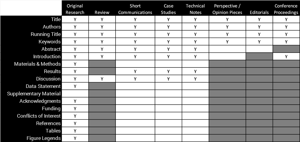 Y = required section; blank cell = author's discretion to include section in manuscript; gray cell = not applicable. (Please note, only the "Original Research" and "Review" articles are peer-reviewed.)